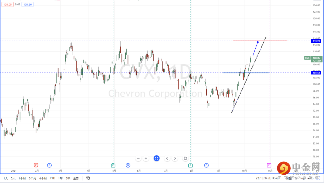 CVX:目前行情在能源产业标的强势带动下继续上行,从CVX整体趋势表现依然处于在多头阶段中,下方有上升趋势线的支撑作用,以及水平支撑带在103.54附近。短期可适当关注价格调整后继续上行的多头机会,上方目标位置参考113.21一带。