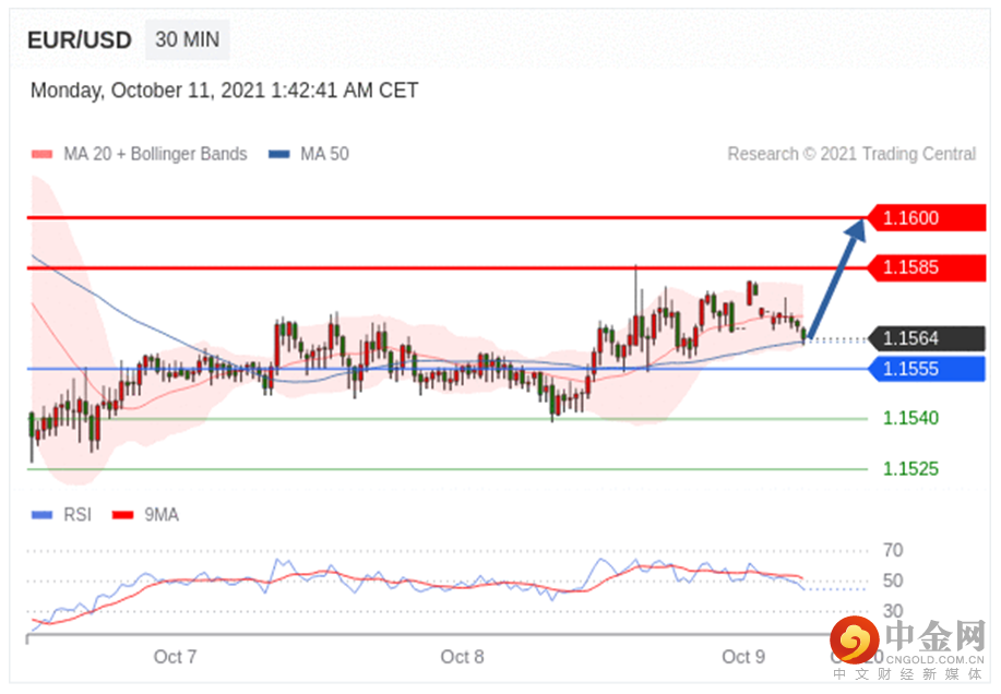 在 1.1555 之上,看涨,目标价位为 1.1585 ,然后为 1.1600 。