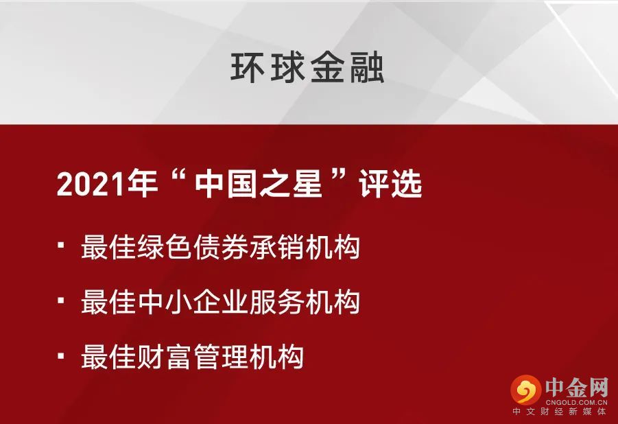 日前,《环球金融》(Global Finance)公布了其2021年“中国之星”评选全部获奖结果。中金公司凭借突出的专业实力和优质的客户服务从激烈竞争中脱颖而出,一举斩获“最佳绿色债券承销机构”“最佳中小企业服务机构”“最佳财富管理机构”三项重量级机构奖项。