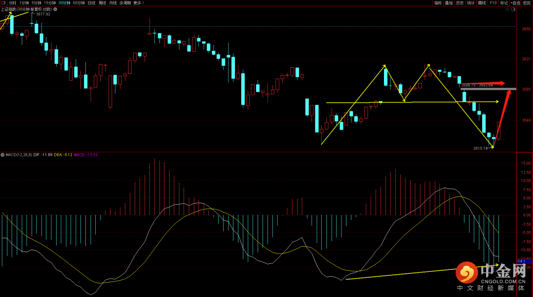 大盘早上出现跳空向下,目前向上的岛型已经失效关注周四是否能够回补周二的向下跳空缺口,如果无法回补且无法站上上升趋势线大概率会出现破位下行,但由于这个位置已经有出现底分型,后续如果出现回落大概率会有一笔反弹。而从周线看这周的后半周如果无法强势大概率会出现周线调整,届时大盘在未来一段时间就不会有太大的行情走势,而向上只有强势突破3630才能突破前期高点出扩张向上走势。