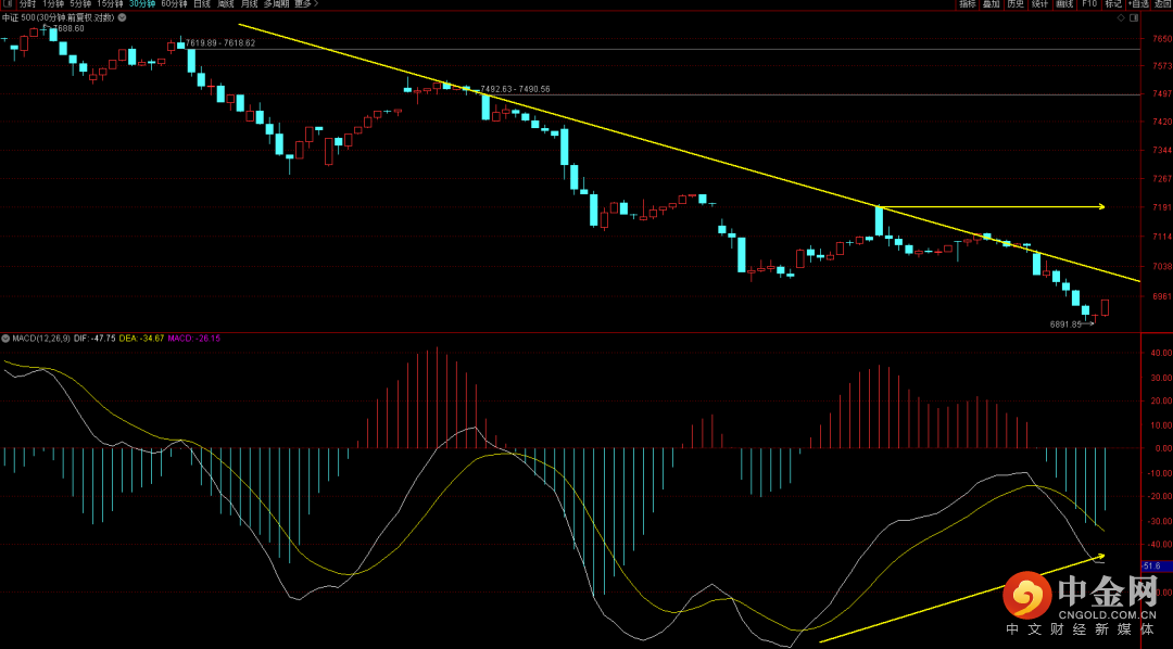 中证500目前出现了三十分钟的底背弛结构,短期大概率会有一笔反弹走势,目前日线走出了扩张向下的走势,后续需要关注是否连续三天跌破上升趋势轨道下轨,如果出现则下跌可能出现扩张。