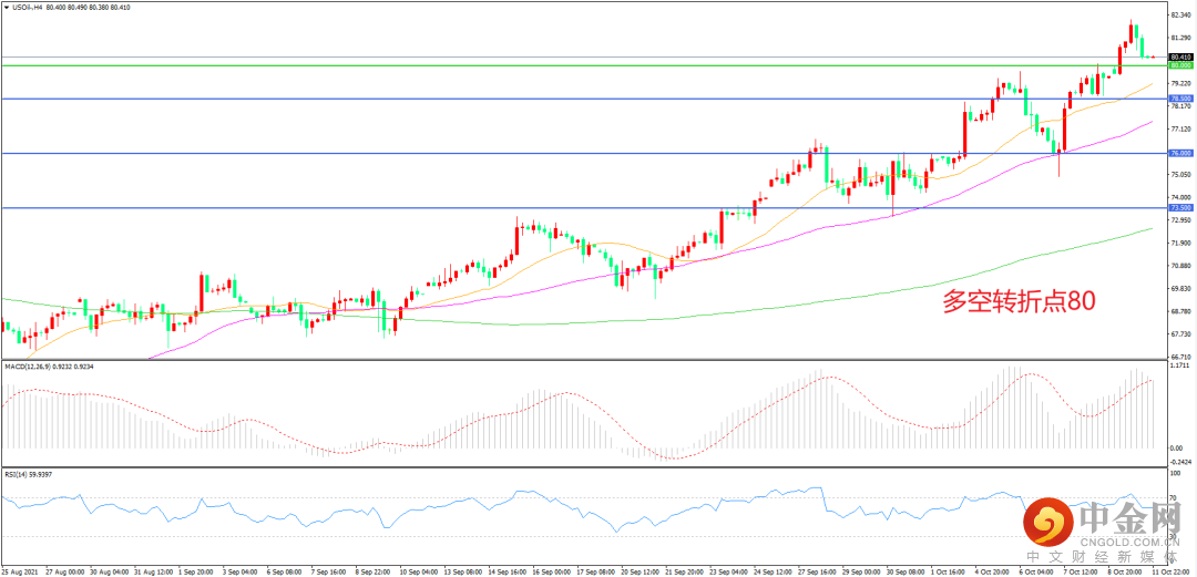 油价周一延续数周以来的涨势,强劲上涨,美油一度上涨至82.14美元/桶,创2014年底以来最高,这是其长达一年的反弹中新的里程碑;随着经济活动的增加和主要产油国限制供应,困扰主要经济体的能源危机没有任何缓解的迹象,煤炭和天然气价格也在飙升,使石油作为发电燃料更具吸引力,推动了油市走高。
