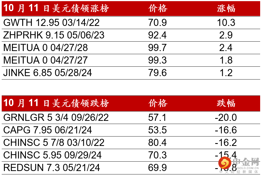 中国高收益债券市场在昨日(10月11日)经历了今年跌幅最大的一天,早盘情绪几乎仅见卖盘,先前较稳定的名字皆有大幅度下跌,雅居乐/奥园/合景泰富下跌15pts,龙光跌10pts,旭辉跌8pts。午后流动性有所好转,部分较高评级债券始见一些买盘。当代置业在公布股东贷款及征求债券延期消息后,表现略有好转,21年到期债券有见部分买盘,收于50-60水平。整体市场有5-20pts不等的跌幅,佳兆业22年到期跌至52水平,奥园/禹洲跌至60左右,雅居乐下跌约5-10pts,中骏下跌约15-20pts。较好评级债券如旭辉/龙光/碧桂园/世茂等也在负面情绪影响下跌约3-10pts。工业板块也普遍下跌,西部水泥/宏桥等下跌约3-6pts。昨日部分发行人持续回购债券,龙光回购1000万美元22年到期债券,弘阳回购500万美元21年到期债券,德信回购120万美元22年到期债券。