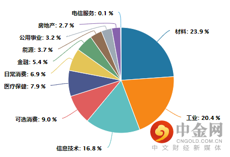 行业分布比较平均,金融地产占比很低,前5大行业分别是:材料(23.9%)、工业(20.4%)、信息技术(16.8%)、可选消费(9.0%)、医疗保健(7.9%)。