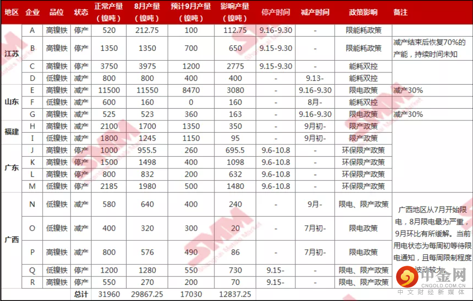 9月高镍铁价格整体呈现高位上涨态势,月内高镍铁价格在1470元/镍点(到厂含税)价格。在9月限电限产政策下,镍铁供需双弱,下表为统计的9月双限对镍铁生产影响(不完全统计)。