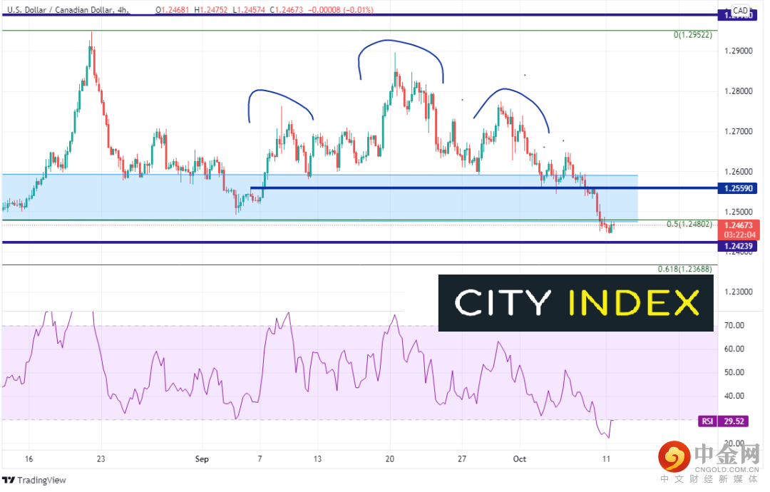 美元/加元4小时图上已经下破一个支撑区域兼6月1日低点到9月20日高点行情的50%回档位,即1.2480附近,如果确实进攻头肩顶形态的目标1.2300,那么首先必须攻克水平支撑位1.2424和前述行情的61.8%回档位1.2369。请注意,4小时图上的RSI正处于超卖状态,美元/加元或先准备迎接盘整或反弹再重拾跌势。上档就是阻力区域,即1.2480-1.2600区间,该区间也包含着200天均线所在的1.2508。头肩顶形态的颈线与50天均线就在该阻力区域上方不远处的1.2623附近。
