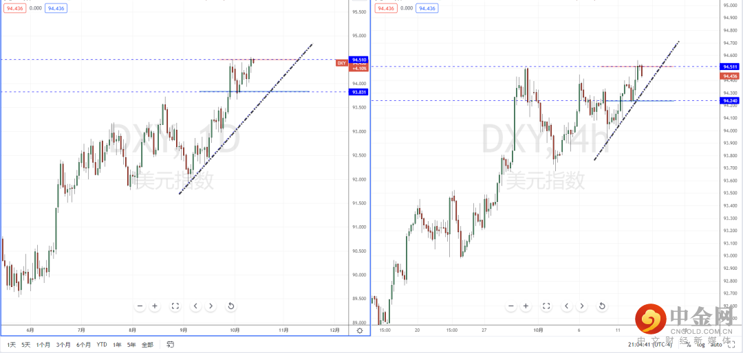 美元指数天图:目前行情虽然处于在多头阶段中,但短期价格已经触及上方关键压制带94.510附近,不宜追多行情。从日内4小时级别,价格在冲击压制区域附近后有受阻迹象,可适当关注价格有效测试上升趋势线与水平支撑带附近再次起稳上行突破的多头机会。