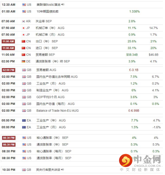 2021-10-12 12:30 AM 澳大利亚 - 商业信心指数 Sep 13,目前数据转正上行,属于利多。2021-10-12 06:00 AM 英国 - 申请失业救济人数 Sep -51.1K,目前数据相对趋平,保持中性。2021-10-12 09:00 AM 德国 - ZEW经济景气指数 Oct 22.3,目前数据继续走弱,属于利空。2021-10-12 02:00 PM 美国 - 招聘信息 Aug 10.439M ,目前数据小幅滑落,属于利空。