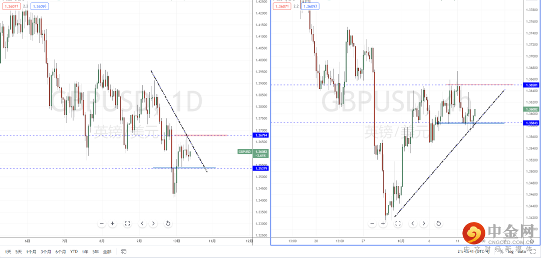 镑美天图:短期价格继续在弱势低位徘徊,虽然趋势有止跌迹象,下方水平支撑带在1.353779附近,但上方依然有多重压制。从日内4小时级别,价格在回测支撑后起稳,可适当关注价格调整后在区间内的反弹多机会,上方目标位置参考1.36501一带。