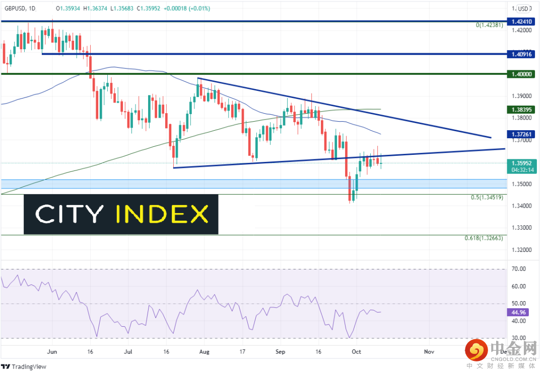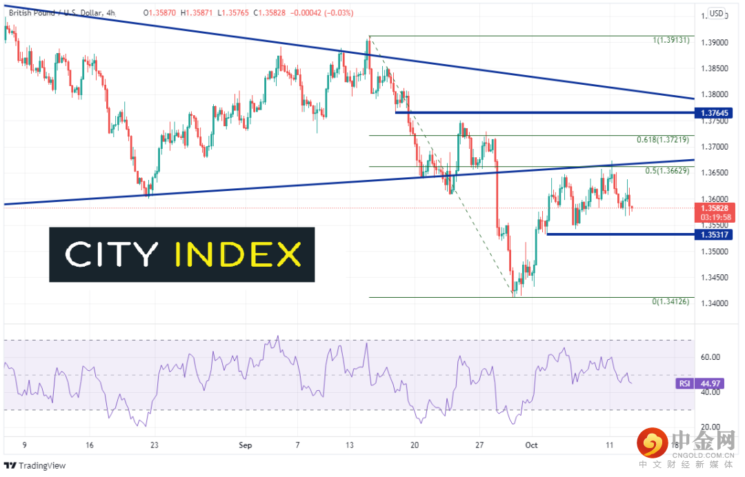 考虑到上述利好数据和英国央行货币政策委员会成员的积极评论,交易者本来对英镑/美元的期待可能高得多。该货币对上周五收在1.3611,目前交投于1.3600附近。7月20日以来,英镑/美元一直交投于对称三角形内,最终在9月28日下破,击穿了2020年9月24日低点到2021年6月1日高点的50%回档位,即1.3450,随后反弹至对称三角形的下轨趋势线阻力1.3600附近。英镑/美元自10月4日以来一直在该位附近徘徊。