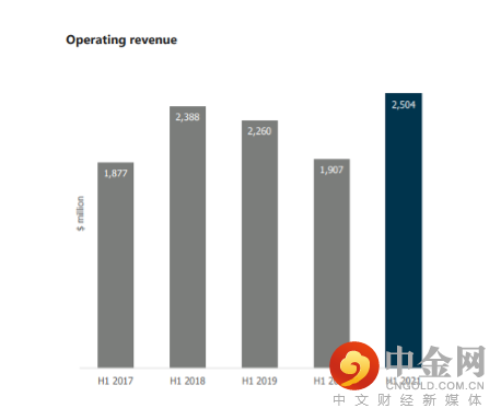 其上半年收入增长31%至25亿澳元,销量增长 6% 至 5390 万桶油当量。