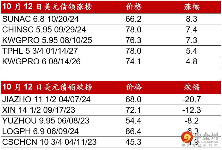 昨日(10月12日),中国高收益债券市场在上周五和周一的断崖式下跌后市场情绪有所好转,较高评级的短端债券有见较多长线基金抄底买入以及对冲基金和做市商的空头回补,部分债券在连日下跌后始见较好涨幅。融创上涨6-8pts,旭辉/合景泰富上涨约5-7pts,碧桂园/世茂/雅居乐/龙光收涨约1.5-3pts,亦有见到仁恒置地买盘,建业/融信短端债券反弹约5-8pts,但长端仍维持较低的价格,时代地产/新城上涨约3-5pt,佳兆业表现弱于大市。