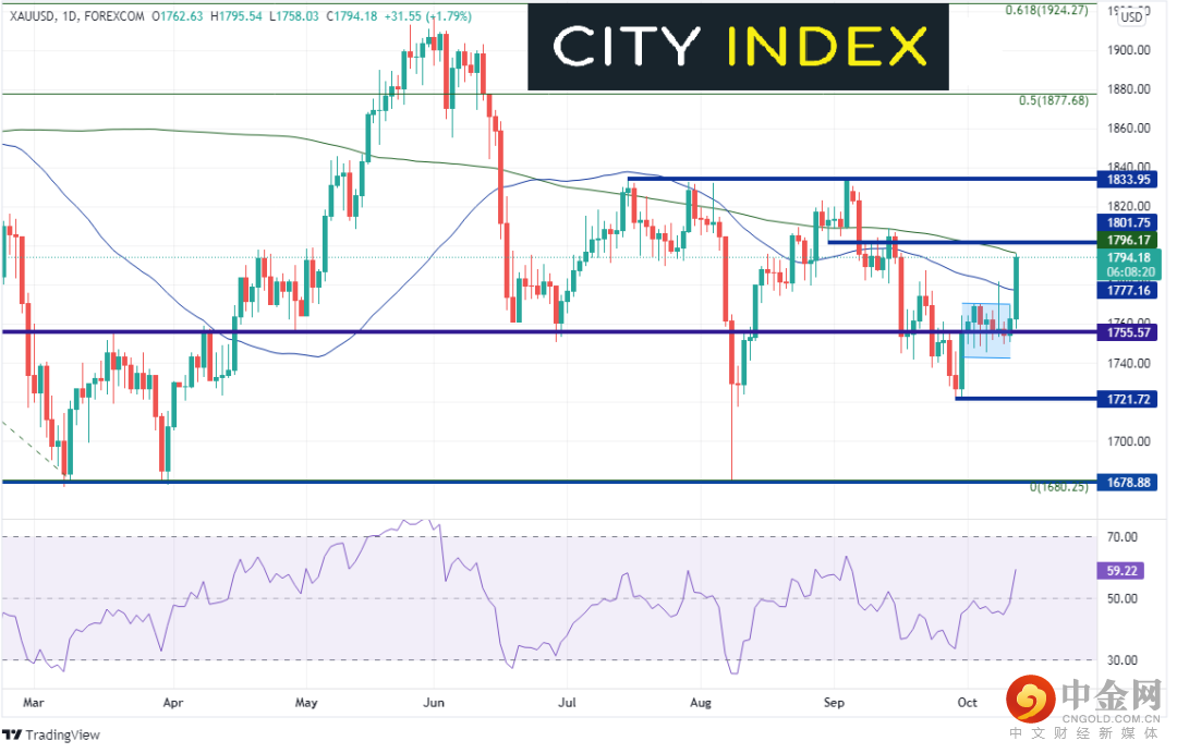 随着美元回撤(欧元/美元上涨),黄金终于得以反弹。10月1日以来,现货黄金/美元一直交投于1745.97-1781.39区间,周三站上该区间和50天均线1777.04,如果可以收于其上,下个重要阻力在1796.15,然后是水平阻力位1801.75和1833.95。第一支撑位在前述区间上轨1769.41附近,接着是周三低点1758.03,然后是水平支撑位1721.72和8月9日低点1678.88。