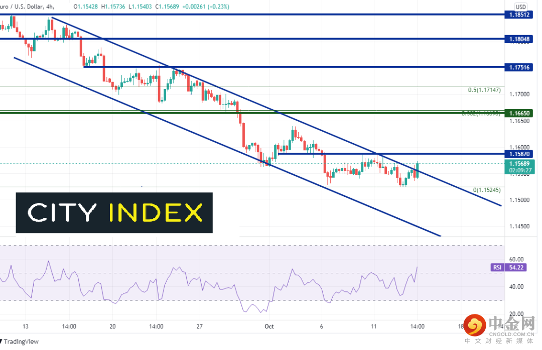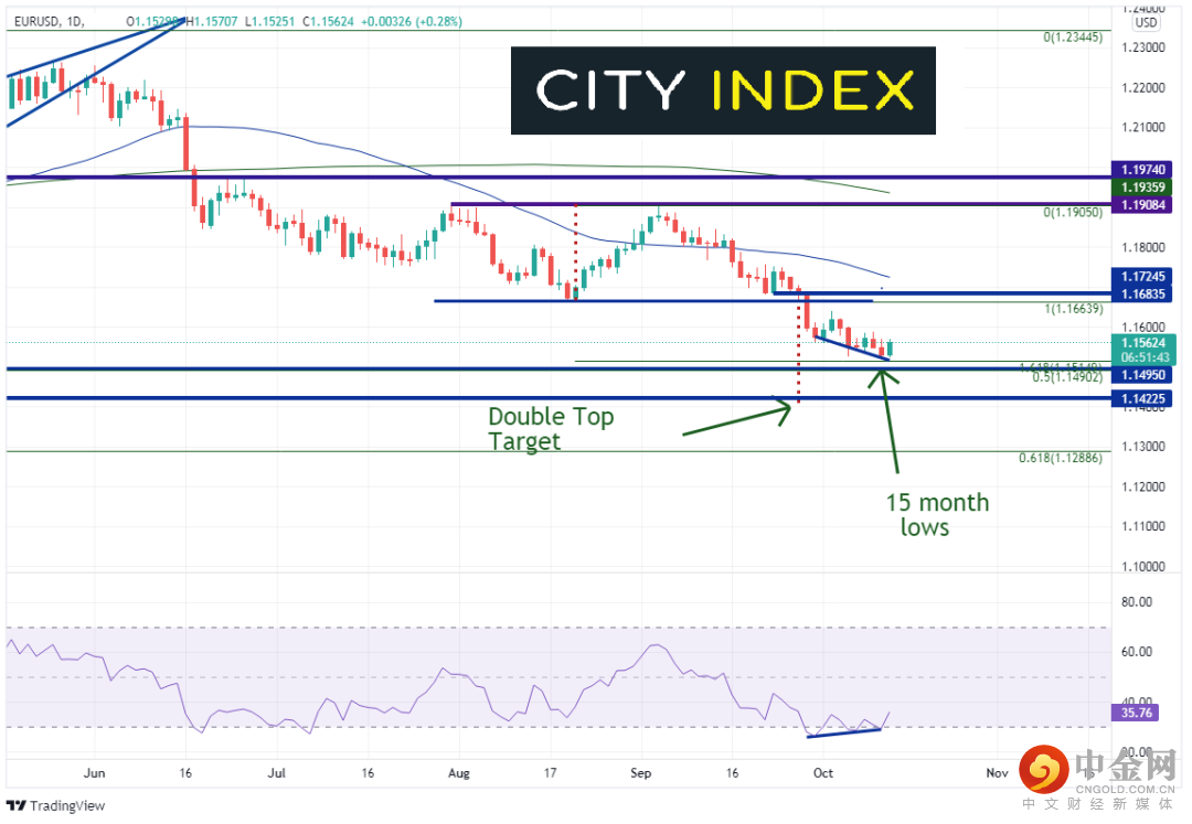 欧元/美元周二在1.1525创下15个月新低,但因RSI与价格背离,价格有可能反弹。