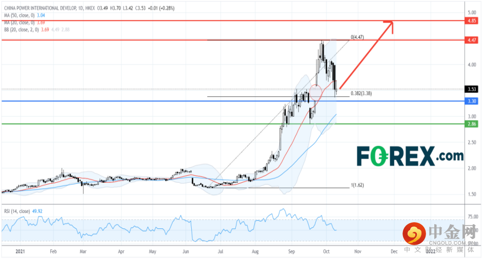 从技术角度看,如日线图所示,中国电力股价经过一轮大涨后进入盘整格局。目前,股价正在补回9月23日的上涨缺口,6月开始的涨幅的38.2%斐波那契回撤位正在提供支撑。