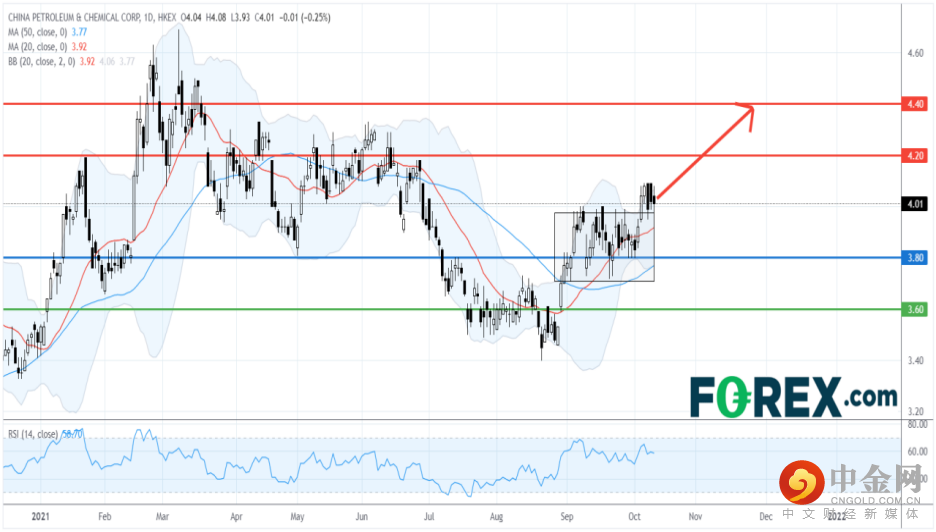 从技术角度看,如日线图所示,中石化呈现更多的站稳迹象。目前,它或已形成了一个较高的底部,并在20日及50日移动均线上方交投。