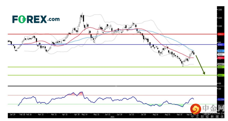 看跌的主要阻力 (止损) 位维持在874元人民币水平。只要价格仍在这水平之下操作,技术格局维持以看跌为主调,价格将很大机会退回600元人民币 (近日低点附近)。