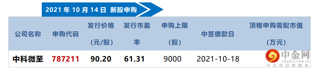 股票简称:中科微至股票代码:688211申购代码:787211发行价格:90.20元/ 股发行市盈率:61.31顶格申购上限:9,000股顶格申购需配市值:9.00万元(沪)申购时间:2021-10-14缴款时间:2021-10-18公司简介:智能物流分拣系统的研发设计、生产制造及销售服务。