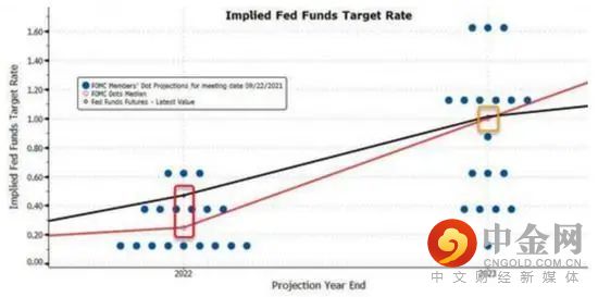 下图蓝点为9月会议时的点阵图,红线为点阵图中位值,黑线为联邦基金利率期货中隐含的利率、也即市场预期的利率: