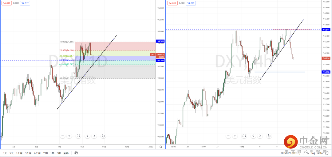 美元指数天图:短期价格在上方关键压制区域附近受阻后下行回落,从黄金分割线目前表现将可能继续测试50%支撑区域。在4小时级别中,价格在承压受阻后下行幅度较大,并且有跌破上升趋势线的支撑作用。可适当关注价格调整后的回落空机会,下方短期目标位置参考93.770附近。