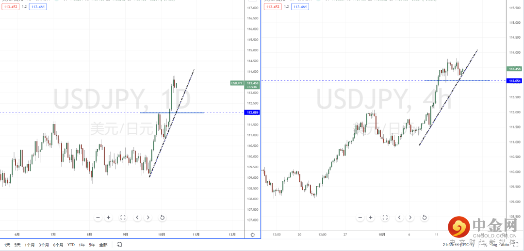 美日天图:目前整体格局继续保持多头方向,下方有上升趋势线的支撑作用。从日内4小时级别,价格在水平支撑带113.054附近调整回测后继续起稳上行,并且下方有上升趋势线的支撑作用。短期可关注价格调整后的多头机会,上方目标位置参考113.789附近。