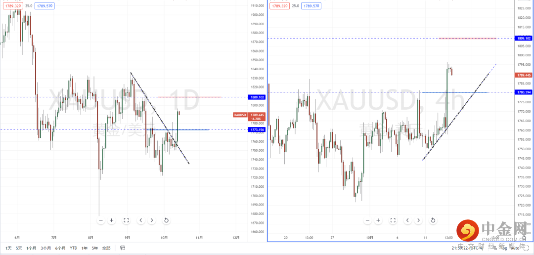 黄金天图:目前趋势在前期底部区间纠结徘徊后一举突破上行,并且价格有效站上多重压制作用,同时也打开上方多头空间。从日内4小时级别,由于短期价格上冲动能幅度较大,不宜追多。可适当关注价格调整后继续向上的多头机会,上方目标位置参考1809.102一带。