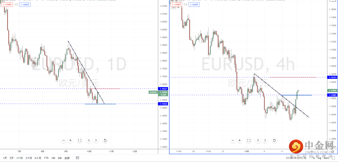 欧美天图:短期行情在相对低位再次筑底起稳,由于受到美元承压受阻,欧美在关键位置附近继续上行冲击,并且冲击下降趋势线的压制作用。从日内4小时级别,短期价格在突破下降趋势线后也同时站上水平压制带。近期可适当关注价格调整后继续上行反弹的多头机会,上方区间目标位置参考1.16323附近。