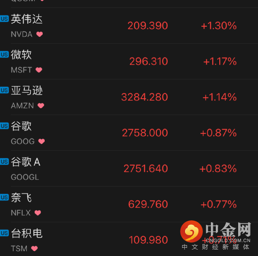 大型科技股也多数收涨,苹果跌0.41%,特斯拉涨0.67%。微软涨1.17%,亚马逊涨1.14%,谷歌涨0.87%,奈飞涨0.77%,Facebook涨0.24%。此外,高通涨1.70%,AMD涨3.92%。