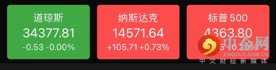 截至收盘,道琼斯指数基本平收,收报34377.81点,标普500指数涨0.30%,报4363.80点;纳斯达克指数涨0.73%,报14571.64点。