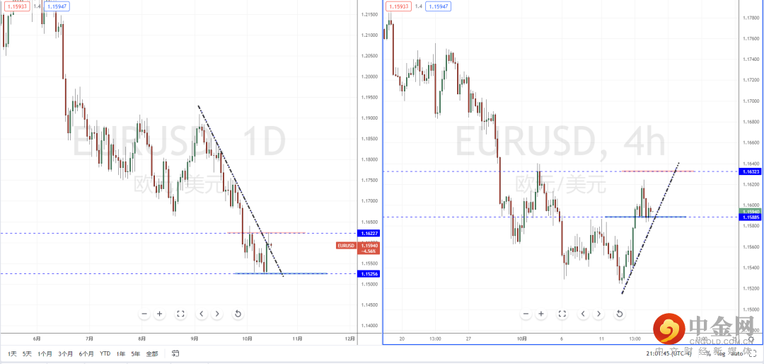 欧美天图:短期趋势虽然有突破下降趋势线的压制作用,但价格在冲击上方水平压制带1.16227区域再次受阻承压。由于行情处于转势初期,需要进一步确认,同时也因美元处于回落阶段对于欧美影响较大。从日内4小时级别,价格也正测试多重支撑区间,可关注价格此区间起稳机会,上方目标位置参考1.16323一带。
