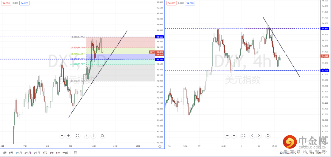 美元指数天图:短期价格虽然回测下方黄金分割线50%中轴点附近有起稳,同时也受到上升趋势线的支撑作用。但从日内4小时级别,价格在短期止跌后依然承压,并且在下降趋势线的压制作用下运行。由于现阶段趋势依然处于调整阶段,可适当关注趋势再次回踩支撑区域后的表现,如果受阻将可能继续下行破位,反之,则起稳反弹上行。