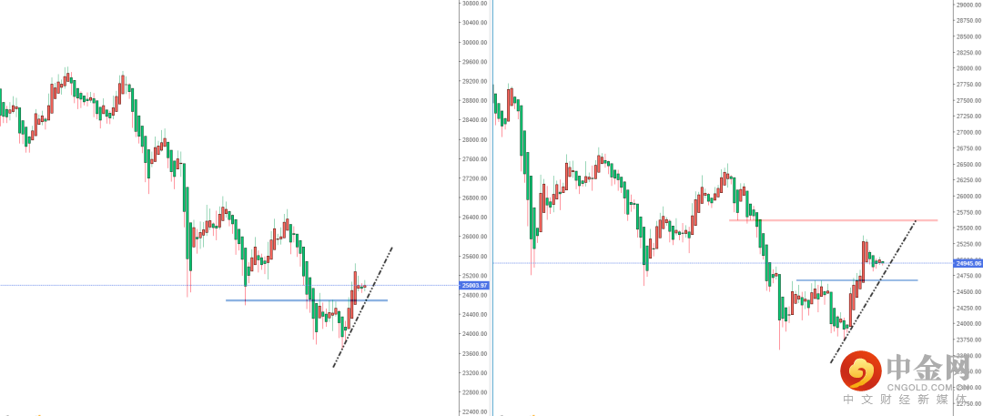 恒生指数天图:目前趋势继续保持多头方向,短期价格依然处在小幅调整阶段,下方水平支撑带在24707.24附近。从日内4小时级别,可关注价格回测上升趋势线与水平支撑带附近再次起稳的多头机会,上方区间目标位置参考25611.61附近。