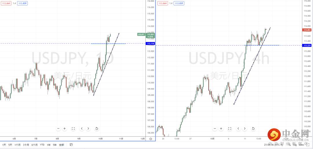 美日天图:目前整体趋势多头格局明朗,下方有上升趋势线的支撑作用,短期水平支撑带在113.118附近。从日内4小时级别,价格也在短期回测调整后再次起稳,可适当关注近期趋势继续调整后上行的多头机会,上方区间目标位置参考周线级别的前期高点。