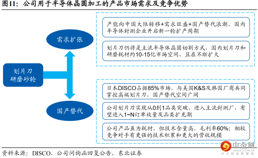 公司划片刀实现从0到1品类突破,成为主流封测厂供应商,主要对华天科技、长电科技、通富微电、日月光、中芯国际下属子公司供应,毛利率达60%。得益于公司强大的技术积累和国产替代浪潮,公司产品有望进入1~N订单放量及品类扩充期。