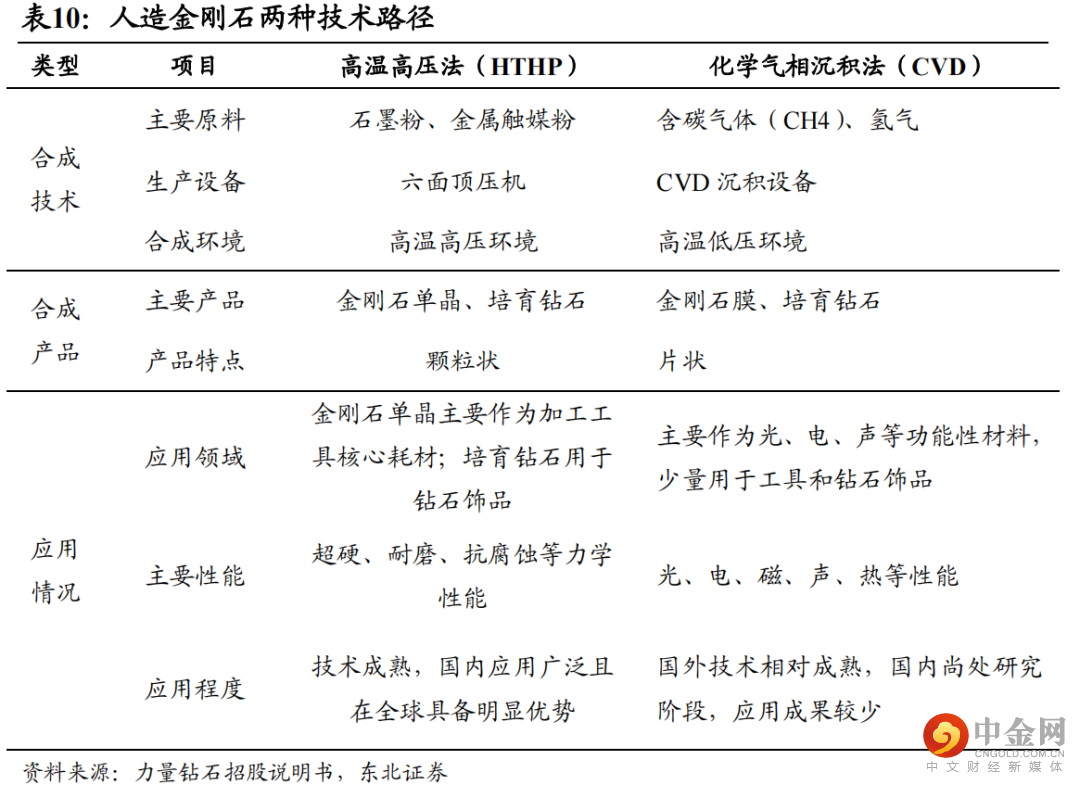 CVD法培育钻石杂质更少,其将成未来材料发展的主流,可广泛应用到如机械加工、通信、半导体、能源、国防、航空航天、军事武器等尖端领域中的关键部位。