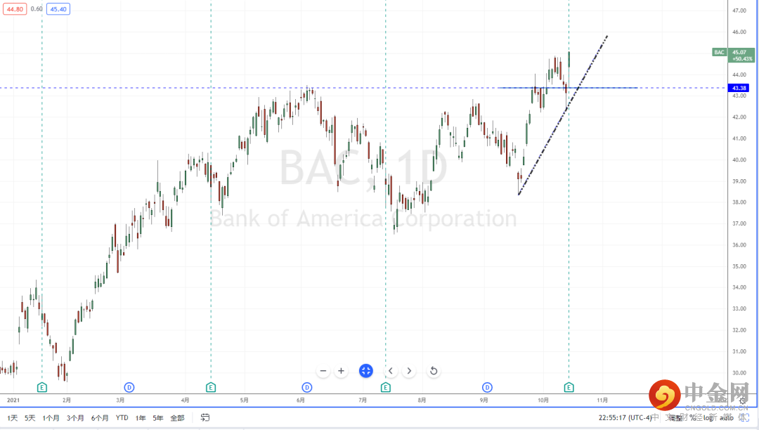 BAC:在短期市场得以缓解之际,以及美国公布的就业和通胀数据缓解了市场对加息前景的担忧,使得金融产业标的再次受益。从BAC目前趋势表现,价格在关键位置回测水平支撑带43.38附近再次起稳,同时也有效测试上升趋势线的支撑作用。可适当关注价格调整后继续上行的多头机会,上方区间目标位置参考周线前期高点附近。