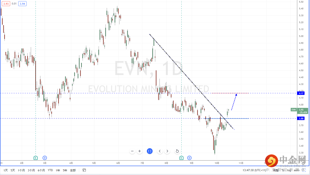 EVN:短期市场趋势有所缓解,大部分ETF产业标的也有明显的拐头上行迹象。另外,又避险情绪影响,相关的一些贵金属个股也在持续下行后筑底起稳。从EVN目前趋势表现,在持续创出新低后起稳,并且有效突破下降趋势线的压制作用,以及水平压制带3.80一带。同时也打开上方多头空间,可适当关注价格调整后继续上行的多头机会,上方目标位置参考4.17区域。