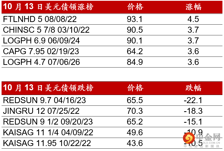 前日(10月13日),由于香港悬挂八号风球,中国高收益债券市场整体交投较少。因有传言指出世茂担保的收购公司(福晟)信托债务违约,世茂早盘大跌约3-6pts,但之后随着公司澄清、长线账户的抄底买入及做市商空头回补,世茂收盘价格较周二仅小幅下跌约0-2pts。午后有传言称佳兆业将无法10月到期票息,随后公司予以否认,但债券仍暴跌约7-10pts,并拖累其他债券表现。正荣下跌约3-5pts,22年及之后债券有较多卖盘。较好评级前端债券如龙光/旭辉/碧桂园/仁恒置地等有见较好需求,上涨约2-3pts。