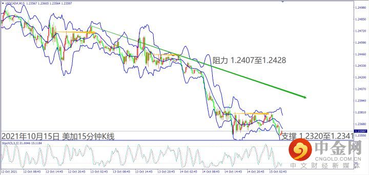 日级别线图,近11天出现9根阴烛,KD空方背离,可能出现反弹;15分钟K线,短线处于盘跌,下降趋势线若刺破,有机会挑战前高阻力。
