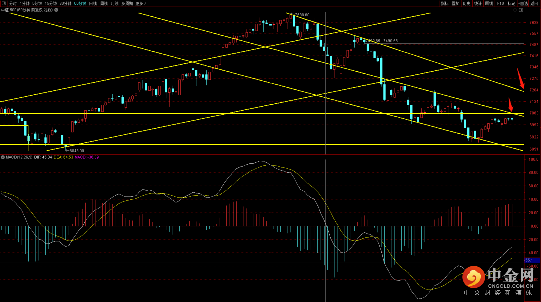 中证500六十分钟反弹走势还未结束,短期关注两段下降趋势线的压制,如果能够突破则反弹空间将出现扩张,而由于日线底分型已经出现,可以考虑进行逢低布局。