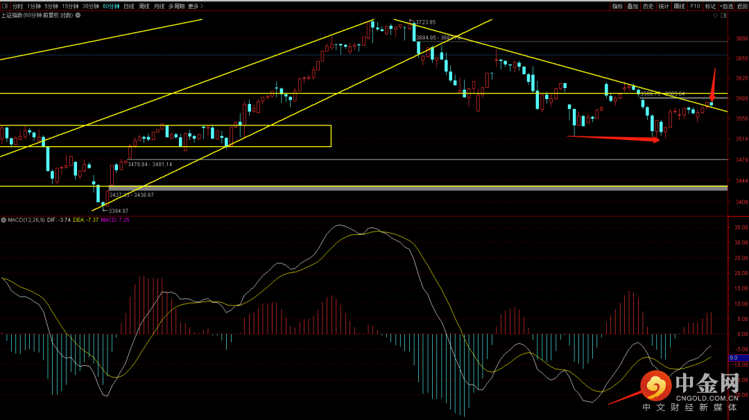 大盘突破了六十分钟的下降趋势线,周一重点关注是否能够守住,如果可以有望在后续行情中去上冲3630点的压制,而下方则需要关注的是3515的支撑,在没有出现跌破之前大概率短期不会有大的下跌。