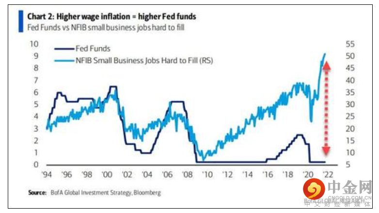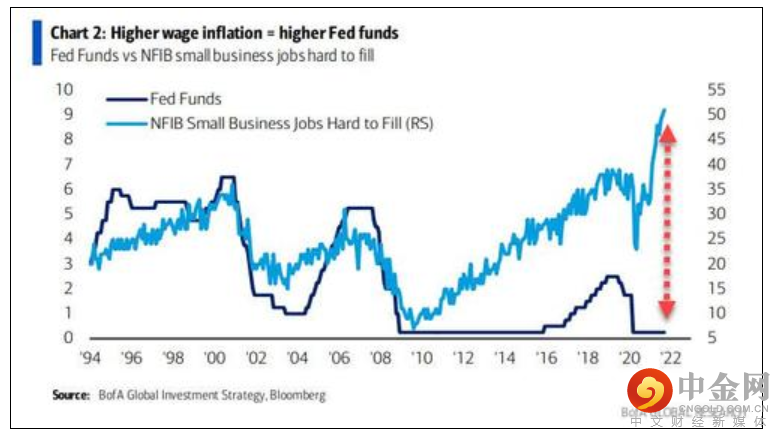 全美独立企业联盟(NFIB)最新调查发现,美国小型企业的劳动力短缺和工资压力达到了50年来之最,而美联储却对这一现象袖手旁观。所有这些都将在2022年带来“利率冲击”。
