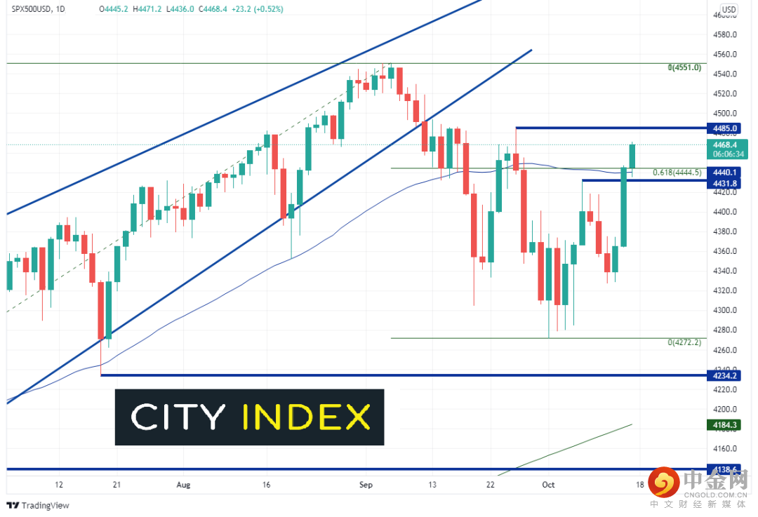 标普500指数“无视”了零售数据走强,升穿9月3日历史高点至10月1日低点下行之61.8%斐波拉契回档位4440.5。此外,该大盘股指数自9月17日以来首次交投重回50天均线上方。之所以说“无视”,是因为2020年3月以来,强劲数据一直利淡股市(意味着美联储离缩减货币刺激更进一步)。标普500指数是否已经在计入11月3日缩表声明?水平阻力位在9月27日高点4485,然后是前历史高点4551。支撑位在4440.1附近50天均线,10月7日高点4431.8附近,10月14日低点4364.7。