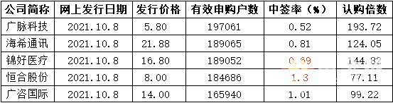 自2021年9月2日,领导人在会上表明要设立北交所后,会议后首批精选层股票的发行于10月8日拉开帷幕,根据从全国中小企业股份转让系统的公开资料录得的数据,这五只精选层股票的有效申购户数在16万到19万不等,中签率在0.52%至到1.3%不等,相较于9月2日之前发行的精选层股票,有效申购户数大幅度增加。本次打新延续了精选层之前的规则,无需市值、现金申购(全额缴付申购资金,待获配股数确定后退回多缴款项)、时间优先。