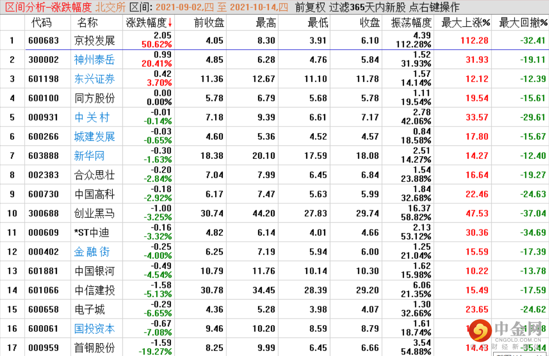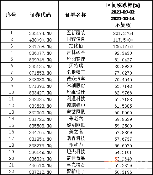 北交所官宣后,原已在精选层上市新股应声大涨,我们统计了该板块66只股票自9月2日至10月14日的股价表现及9月3日当天的股价表现。从数据来看,阶段内精选层66只个股平均涨幅35.85%,基本处于普涨态势;涨幅最高的五新隧装区间涨幅201.88%,同辉信息117.5%,拾比佰106.52%;涨幅超过50%的个股有22只,占精选层目前总比例的33.3%。