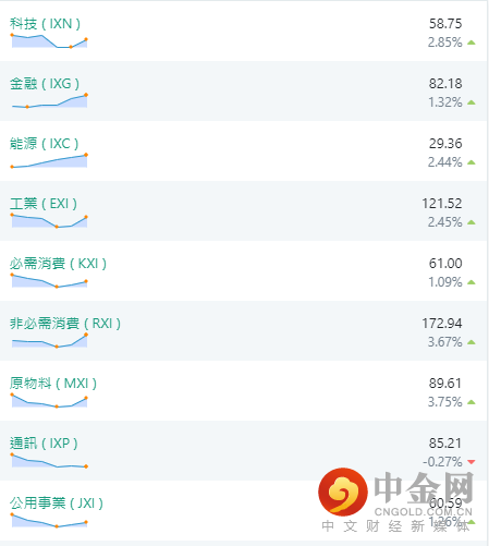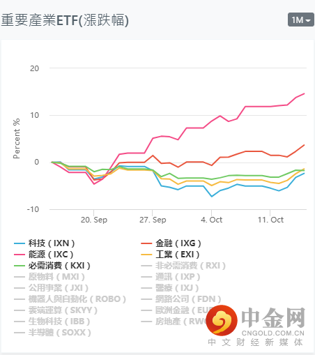 目前市场环境趋于偏多,美股三大指数集体收高,银行股是当日涨幅最大的板块之一,标普银行股板块攀升2.1%。由于市场受到强劲的第三季度业绩报告,道指、标普500指数近期创下单周最大涨幅。从ETF产业的表现,目前整体趋势均处于拐头上行之中,能源产业与金融产业继续保持领涨,但产业之间依旧有明显分化。短期关注:科技(IXN)金融(IXG),能源(IXC),工业(EXI),原物料(MXI),医疗(IXJ),云端运算(SKYY),网络公司(FDN),欧洲金融(EUFN),房地产(RWO)产业中个股的多头机会。