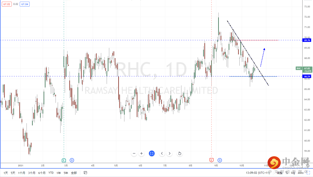 RHC:短期市场环境在强劲的数据刺激作用下大幅扭转,并且市场情绪也逐步升温,从ETF产业标的均处于拐头上行之中。从RHC目前趋势的表现,其趋势在前期持续下行测试水平支撑带66.24区域止跌,虽然上方有下降趋势线的压制作用。但可适当关注价格调整后继续上行突破的多头机会,上方目标位置参考69.76一带。