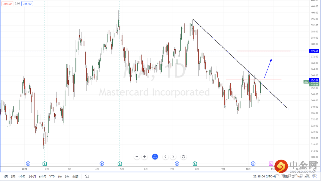 MA:目前市场环境在近期强有力的数据刺激下,转势向上。同时也推动前期处于弱势的ETF产业走势。从MA目前整体趋势在下方区间纠结调整后止跌上行,价格也正处于冲击上方多重压制区域。近期可适当关注价格调整后继续上行突破的多头机会,上方区间目标位置参考375.63一带。