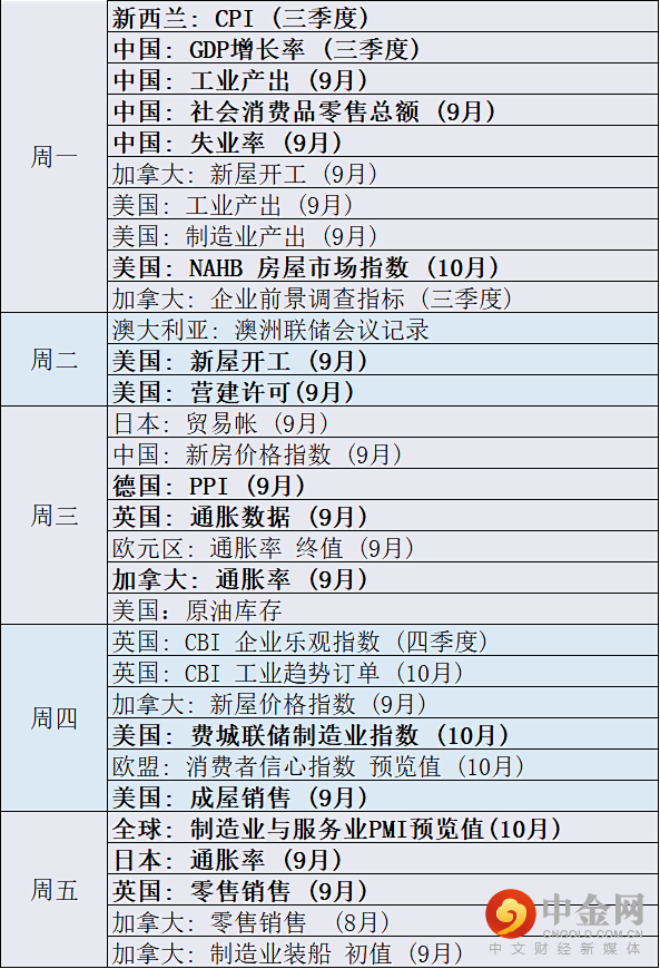 而本周的经济日历重心将偏离美国。新西兰、德国、欧元区、加拿大和日本将公布通胀报告。通胀的上升将继续推动基金进入风险资产?抑或交易者担心美联储缩表从而减持风险资产?另外,中国将公布三季度GDP、9月工业产出、社会消费品零售总额和失业率。