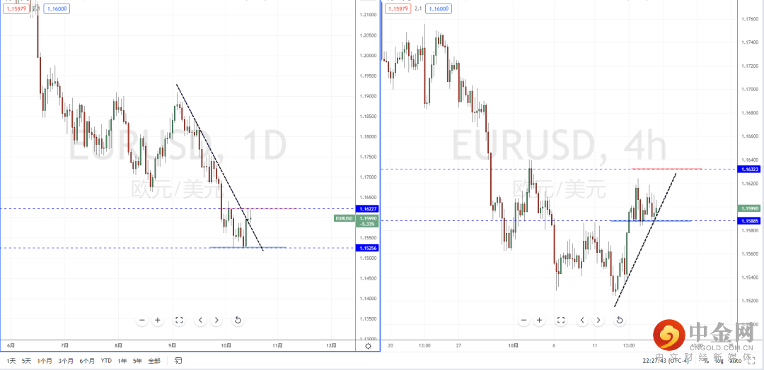 欧美天图:短期价格在冲击上方水平压制带1.16227附近继续承压,由于美元在关键位置止跌,使得欧美将继续走弱。从日内4小时级别,其趋势承压后继续回测支撑带1.15885附近。可适当关注价格在此附近的表现,如果破位下行,下方目标位置参考1.15428一带。